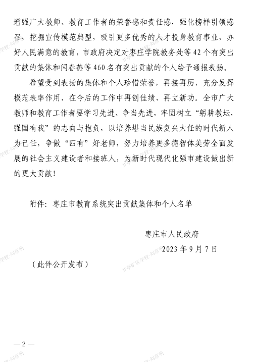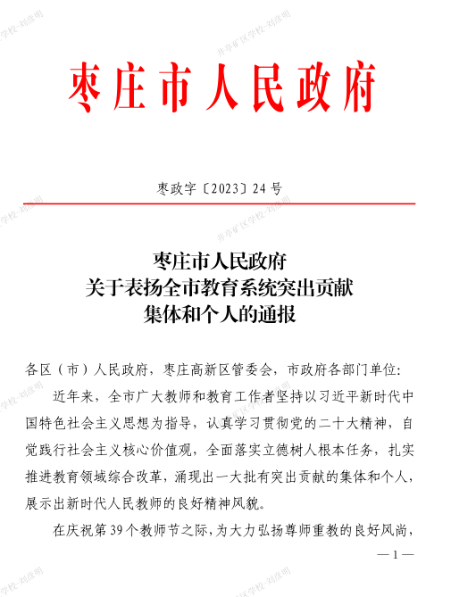 柴里矿区学校荣获枣庄市教育系统突出贡献集体